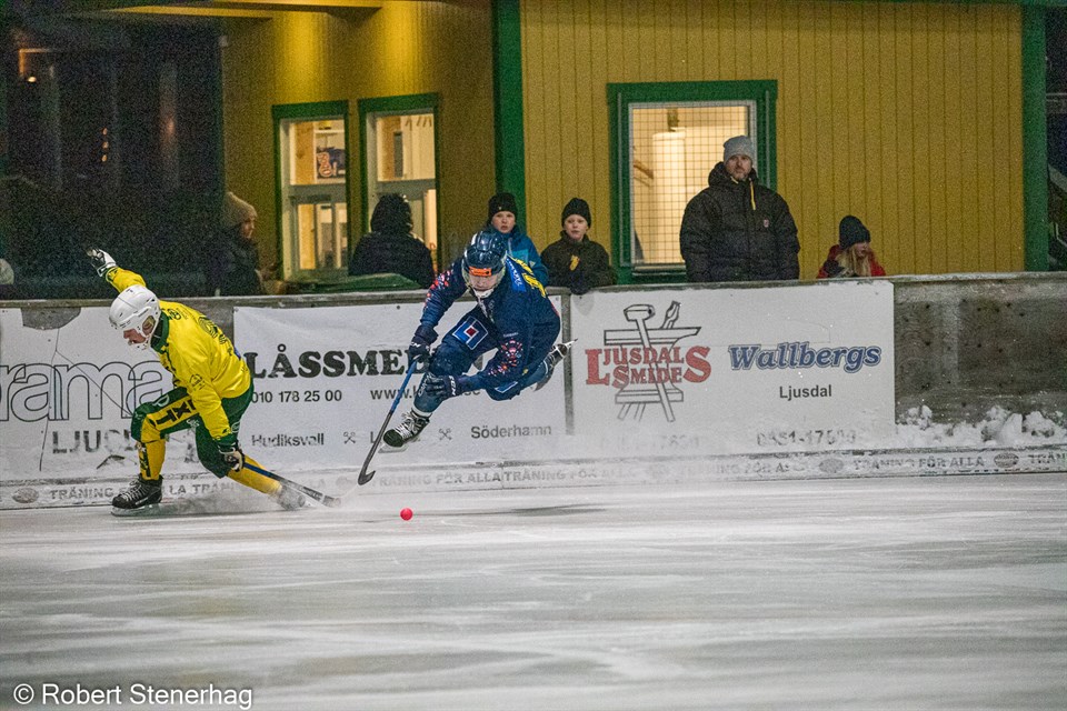 Falu BS föll på Ljusdals IP mot topptippade hemmalaget som vann med 2-1 (1–1) på trettondagen. BS tog ledningen, målet gjordes av Isac Johansson, grym nedtagning på friläge på ett fint lyft av Fredrik Eriksson. Det var en jämn och tight match där BS hade ett tveksamt bortdömt mål. – Vi spelar med högre energinivå nu, säger lagkapten Micke Olsson till DT. – Visst, en bra defensiv...men vi tog steg även offensivt i dag. Vi är helt klart med i matchen och den står och väger länge, det kunde lika gärna ha slutat med ett kryss och vi var värda en poäng. Lite surt känns det allt. På lördag väntar Kungälv på Skarpe Nord. Foto: Robert Stenerhag Ljusdals BK–Falu BS 2–1 (1–1) Mål: 0–1 (26) Isak Johansson (Fredrik Eriksson), 1–1 (36) Elias Swartswe (Klim Tarasenko), 2–1 (77) Jonas Söder (Isak Flodberg). Hörnor: 8–3 ( 4–3 ). Utvisningar: Ljusdal 4 x 10, 1 x 5 Falun 3 x 10. Domare: Peter Persson. Publik: 234.