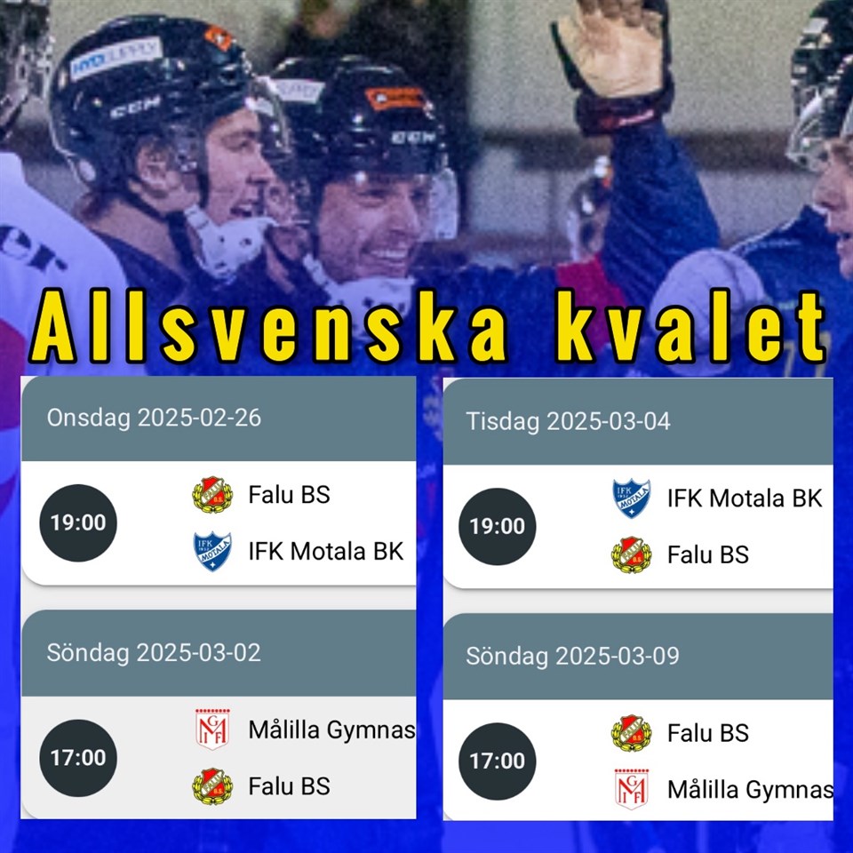 Motala hemma nu på onsdag 26/2 kl 19 – så spelas allsvenska kvalet💥 Under söndagen spelades div 1 klart och därmed står det klart att BS kvalmotståndare blir IFK Motala och Målilla. Vi börjar hemma mot Motala på onsdag kl 19. Alla till Lugnet! Företag och privatpersoner kan vara med och stötta BS i ”Kvalkampen” Förutom nervkittlande matcher så kommer kvalet också medföra extra kostnader för föreningen som vi inte budgeterat med. Laget kommer också ingå i kvalgrupp Ost, där motståndarna Motala och Målilla finns, vilket ger även extra långa resor än vad en geografisk indelning kanske ska ge. Därför vänder vi oss till dig för att hjälpa till att dra in några sista värdefulla slantar. Målsättningen är att på denna korta tid (en vecka) dra in 100 000kr extra. Vi har redan fått in 54 000, fantastiskt! Samtliga deltagande företag/privatpersoner omnämns på Falu BS Bandys hemsida och i Falu BS sociala kanaler samt via speaker under matcherna. (Falu BS Instagramkonto har ca 3500 st unika följare) Silver Privat: 500 kr 1st kvalpass Guld Privat: 1 000 kr 2st kvalpass inkl. kaffe Silver företag: 2 000 kr 2st kvalpass Guld företag: 3 000 kr 4st kvalpass inkl. kaffe Platinum företag: 5 000 kr 8st kvalpass inkl. kaffe + 1st matchtröja Om du deltager själv med 500kr eller mer swisha till 123 386 23 72 och ange ”kvalkampen+namn”. Tillsammans är vi starka, BS HEJ💙💛🔥